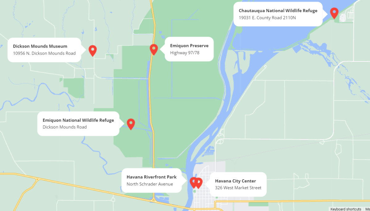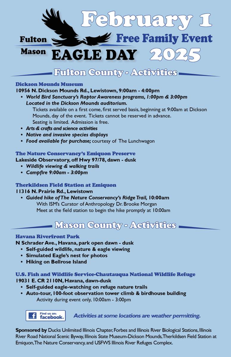 Fulton and Mason Counties' Eagle Day! Visit the Dickson Mounds Museum, The Nature Conservancy's Emiquon Preserve, Therkildsen Field Station Emiquon, Havana Riverfront Park, U.S. Fish and Wildlife Service - Chautauqua National Wildlife Refuge.