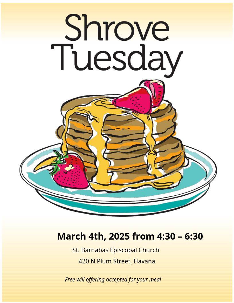 Come and eat pancakes at St. Barnabas Episcopal Church - 420 North Plum Street, Havana - on Tuesday, March 4, 2025, 4:30-6:30 p.m. There will be a free will offering for your meal!