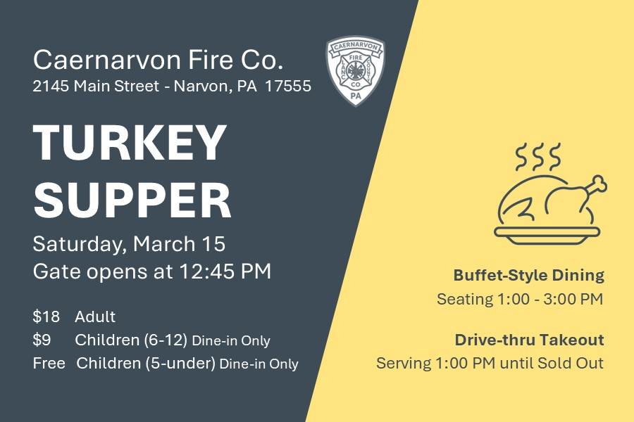 Saturday, March 15, 2025 join us for our annual Turkey Supper. Gate opens at 12:45pm, Seating 1:00pm to 3:00pm or until sold out. Buffet style dining or drive thru take out. $18 adult, $9 children 6-12 Dine in only, free for children 5 and under. More information please call 717-445-0679