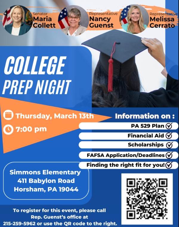 State Representative Guenst, Senator Maria Collett and State Representative Melissa Cerrato are hosting a College Prep Night for families and children who are considering higher education for their future on Thursday, March 13, 2025 beginning at 7:00 PM. This event will be taking place at Simmons Elementary, 411 Babylon Road, Horsham, PA 19044.