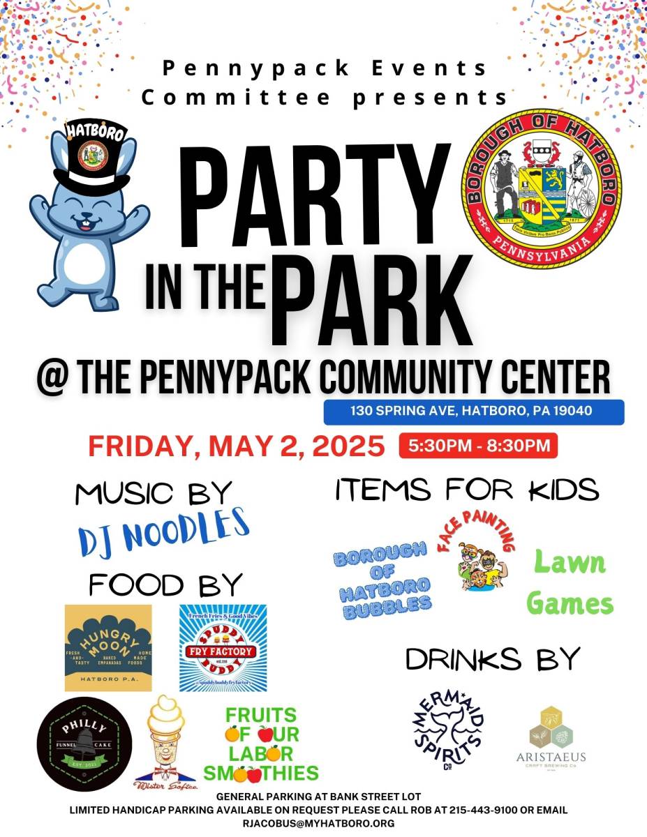 Join the Pennypack Events Committee for the 2025 Party in The Park events! These events take place on the grounds of the Pennypack Community Center, 130 Spring Avenue, Hatboro, PA 19040 from 5:30 PM to 8:30 PM.