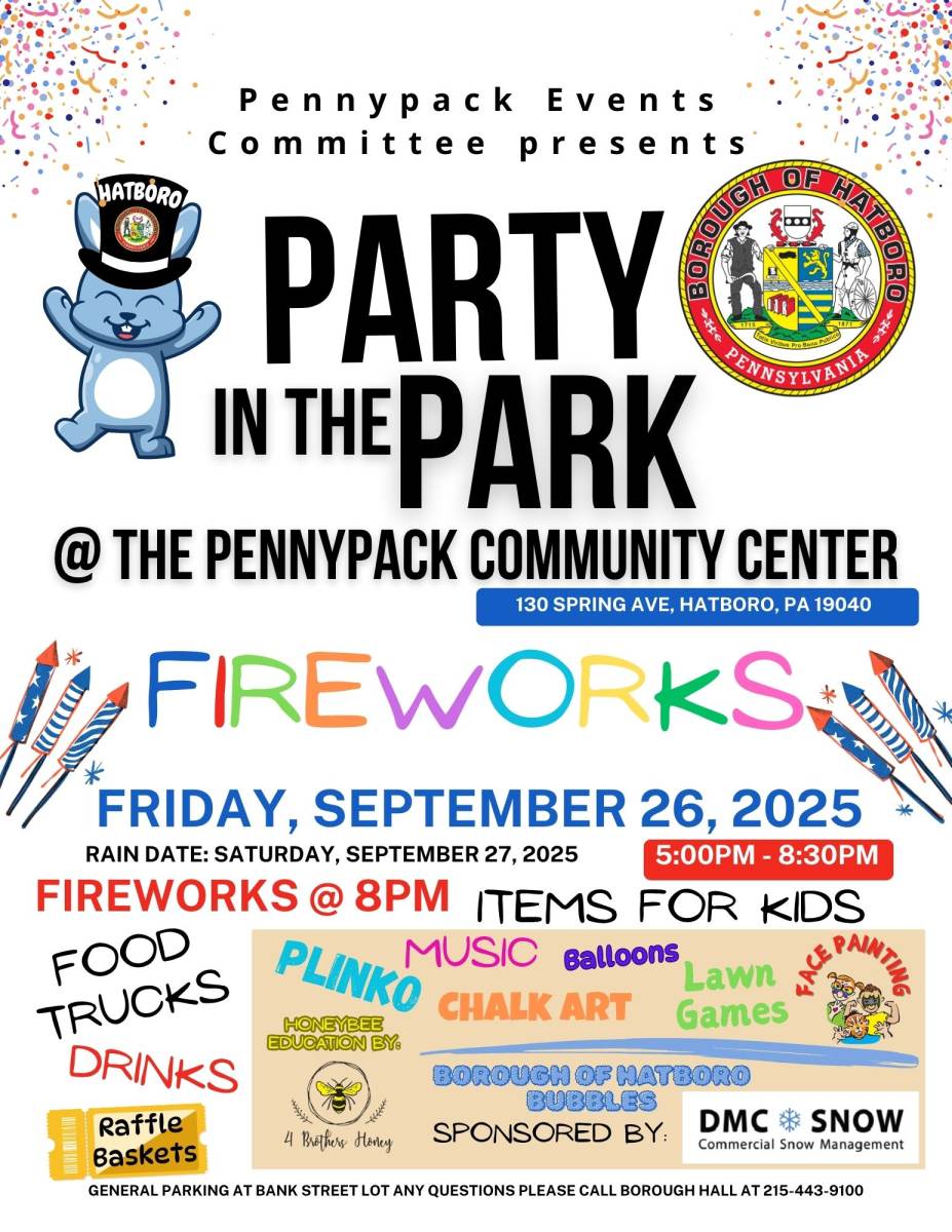 Join the Pennypack Events Committee for the last 2025 Party in The Park event! This event takes place on the grounds of the Pennypack Community Center, 130 Spring Avenue, Hatboro, PA 19040 from 5:00 PM to 8:30 PM. Fireworks will begin around 8pm.