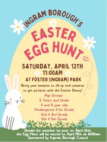 Please join Ingram Borough for it's annual Easter Egg Hunt on Saturday, April 12th at 11:00 a.m. in Foster (Ingram) Park. Thank You.
