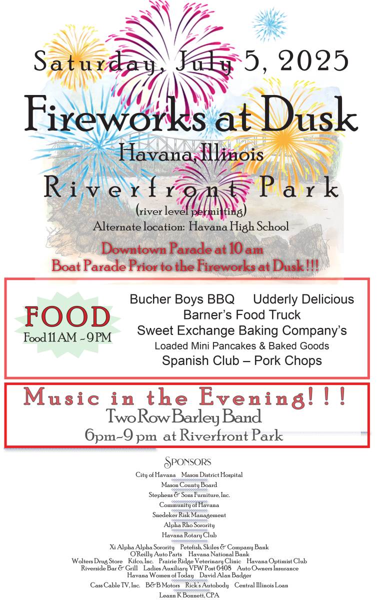Fireworks will be held at Riverfront Park (weather permitting) on Saturday, July 5, 2025 at dusk.