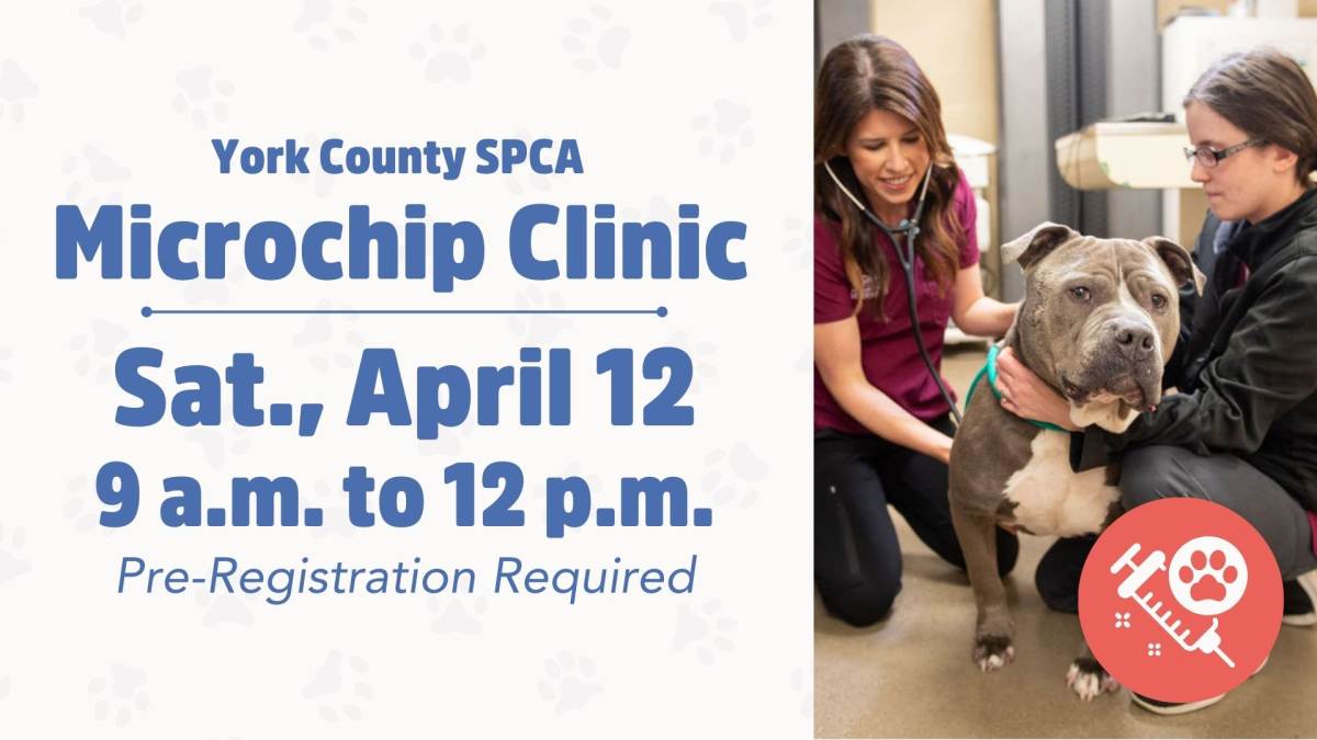 York, PA – March 28 – The York County SPCA will offer a low-cost microchip clinic on Saturday, April 12 to help pet owners protect their beloved animals. The event will be held at the York County SPCA, located at 3159 Susquehanna Trail N. from 9 a.m. until noon.