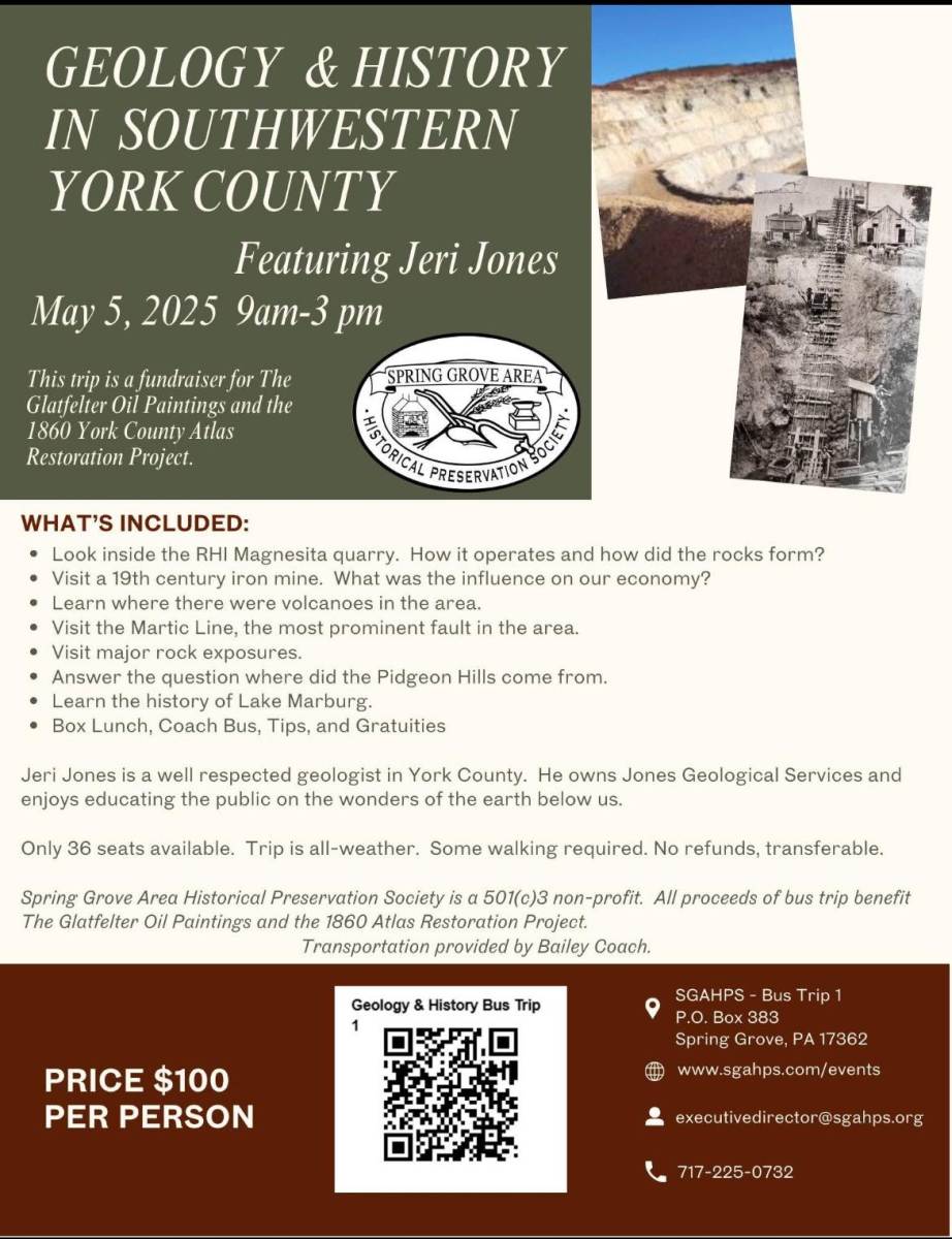 May 5th: Geology & History Bus Tour. Register online at https://sgahps.org/store