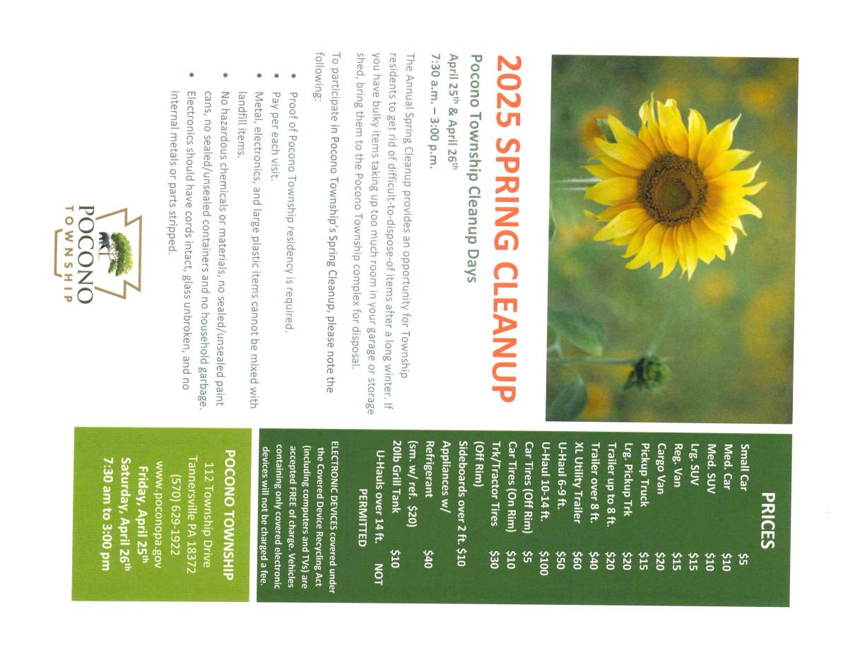 Gather up your unwanted items and bring them to our Spring Clean-Up Event on April 25th & 26th from 7:30 AM – 3:00 PM at 112 Township Drive. This is a great opportunity to declutter and dispose of bulk items properly.