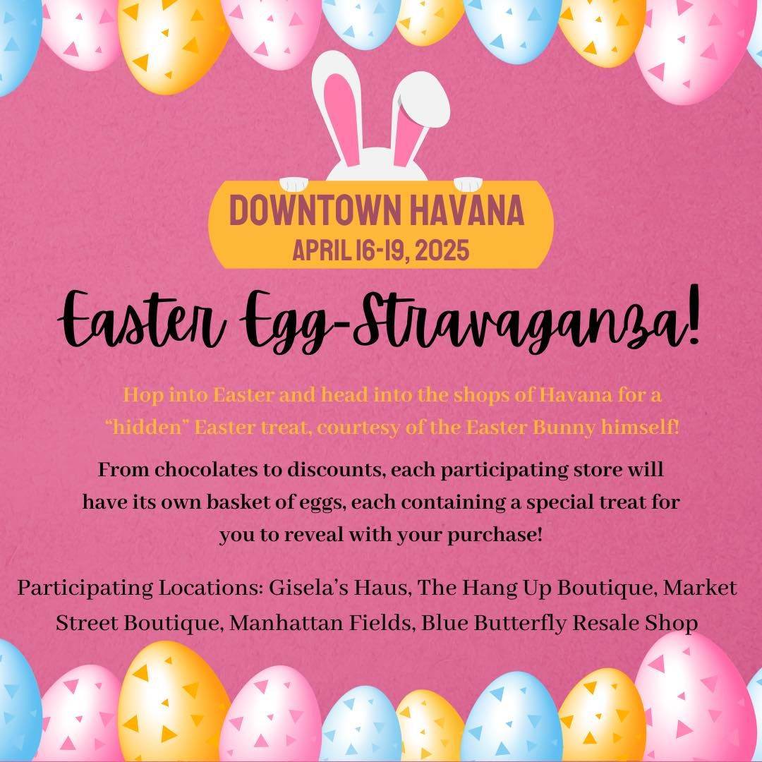 Hop into Easter and head into the shops of Havana for a "hidden" Easter treat, courtesy of the Easter Bunny himself! From chocolates to discounts, each participating store will have its own basket of eggs, each containing a special treat for you to reveal with your purchase! Participating Locations: Gisela's Haus, The Hang Up Boutique, Market Street Boutique, Manhattan Fields, Blue Butterfly Resale Shop.