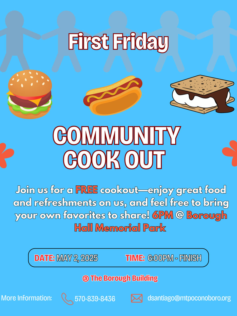 join us for a FREE cookout—enjoy great food and refreshments on us, and feel free to bring your own favorites to share! 6PM @ Borough Hall Memorial Park