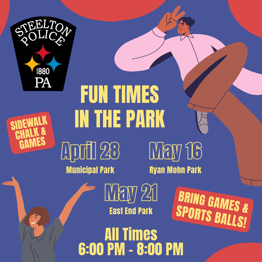 *UPDATE* Tonight’s (5/16) Fun Times in the Park at Ryan Mohn Memorial Park is postponed to tomorrow, Saturday, May 17. Please contact Officer Anderson at tanderson@steeltonpa.com with any questions or concerns.