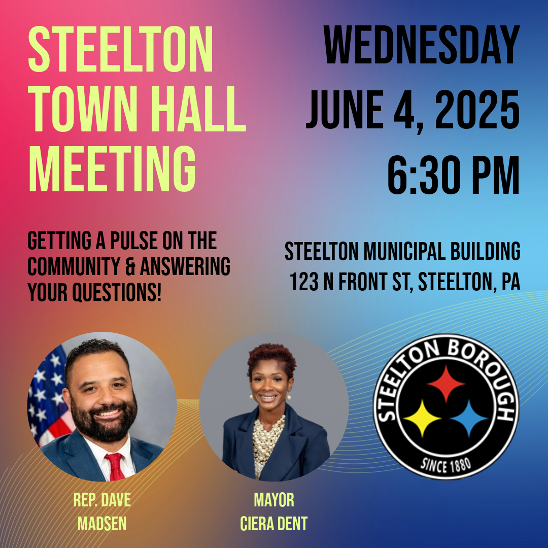 Mayor Ciera Dent will be hosting a town hall meeting at the Steelton Borough Municipal Building on Wednesday, June 4 at 6:30 PM. State Representative Dave Madsen will also be in attendance to answer questions and assist residents. Join us as we keep our pulse on the community, learn about your needs, and hear your thoughts on the issues that matter most.