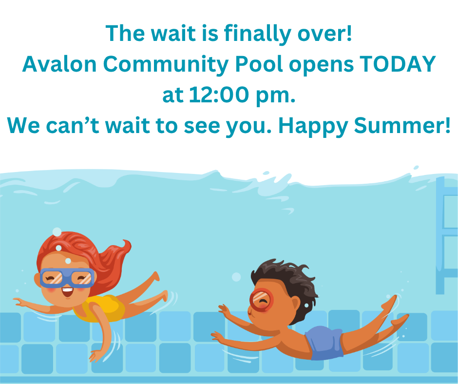 After a season-long hiatus for repairs, the Avalon Community Pool will open for Summer 2025 on Saturday, June 14 at 12:00 pm. We can't wait! Looking forward to a summer of fun in the sun.