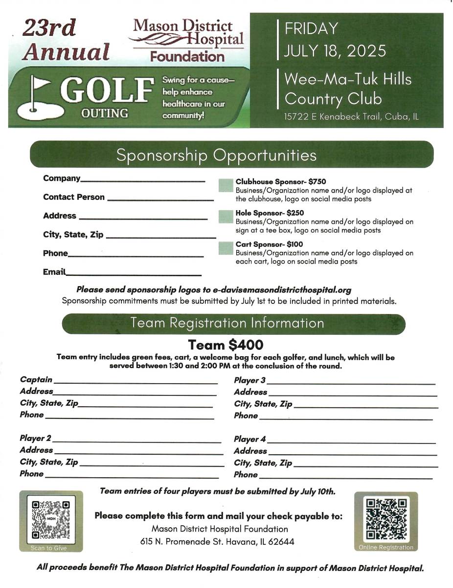 Swing for a cause - help enhance healthcare in our community! There will be a four person scramble - $400 per team to be played at Wee-Ma-Tuk Hills Country Club on Friday, July 18, 2025. 8 a.m. check in with a 9 a.m. tee off. There will be lunch, cash prizes and raffles. Registration deadline is July 10th. There are also sponsorship opportunities. Help support our healthcare!