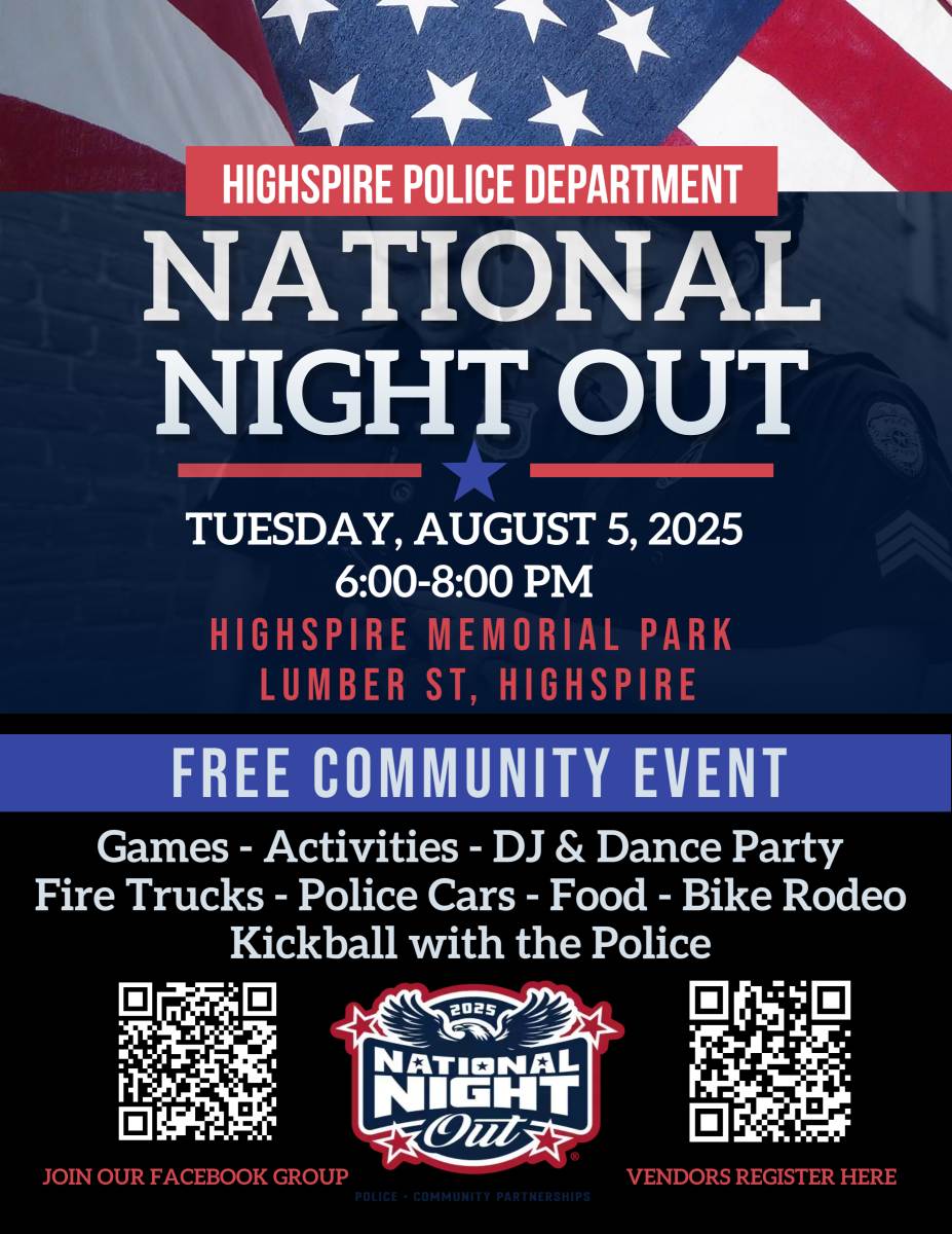The Highspire Police Department is pleased to announce National Night Out 2025. This year's National Night Out is scheduled for Tuesday August 5, 2025 from 6:00pm to 8:00pm at Highspire Memorial Park, located at 50 Lumber Street, Highspire, PA, behind Champions Sports Bar. Follow Highspire National Night Out on facebook.