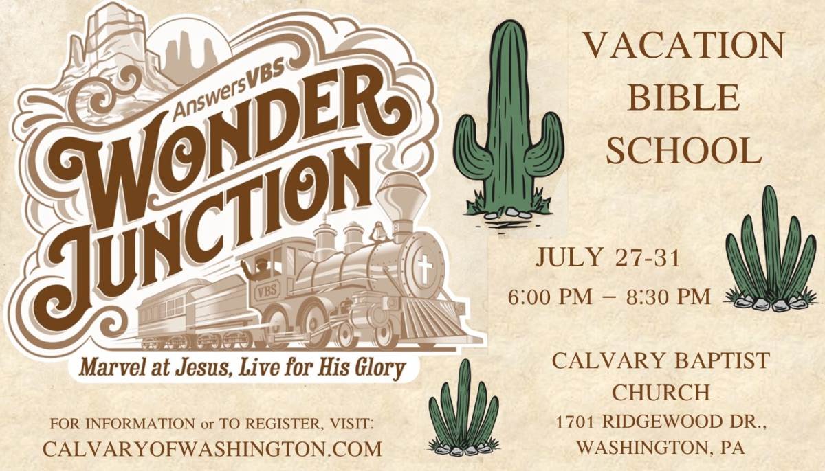 Join them for a memorable week as Calvary Baptist Church transforms into Wonder Junction for a week of Wild West Adventure! All aboard for crafts, story time, sing-along songs, tasty snacks, and nightly drama!