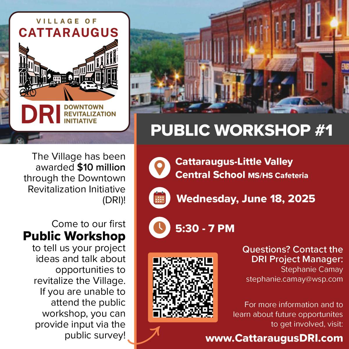 The first Public Workshop for the Village of Cattaraugus DRI will be held on Wednesday, June 18 from 5:30 to 7:00 p.m. in the Cattaraugus-Little Valley School Cafeteria. The workshop will include a brief presentation on the Downtown Revitalization Initiative and the Village’s DRI application, followed by interactive exercises to gather feedback on community issues, opportunities, and needs, as well as the vision, goals, and strategies for revitalization. Copies of the public survey will be available to complete during the workshop, or it can be completed online.